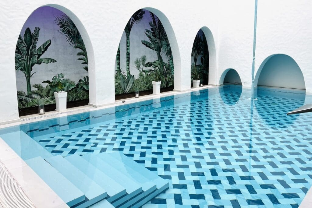 Guests also have complimentary access to the Spa, featuring a hammam, sauna, jacuzzi, and indoor seawater pool.