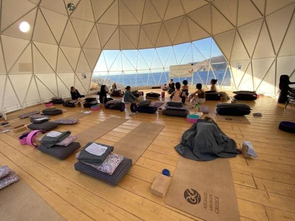 The custom-made Rashmi geodesic dome at SeaRock offers a unique and tranquil space for yoga and meditation, overlooking the deep blue Aegean and surrounded by Amorgian nature.