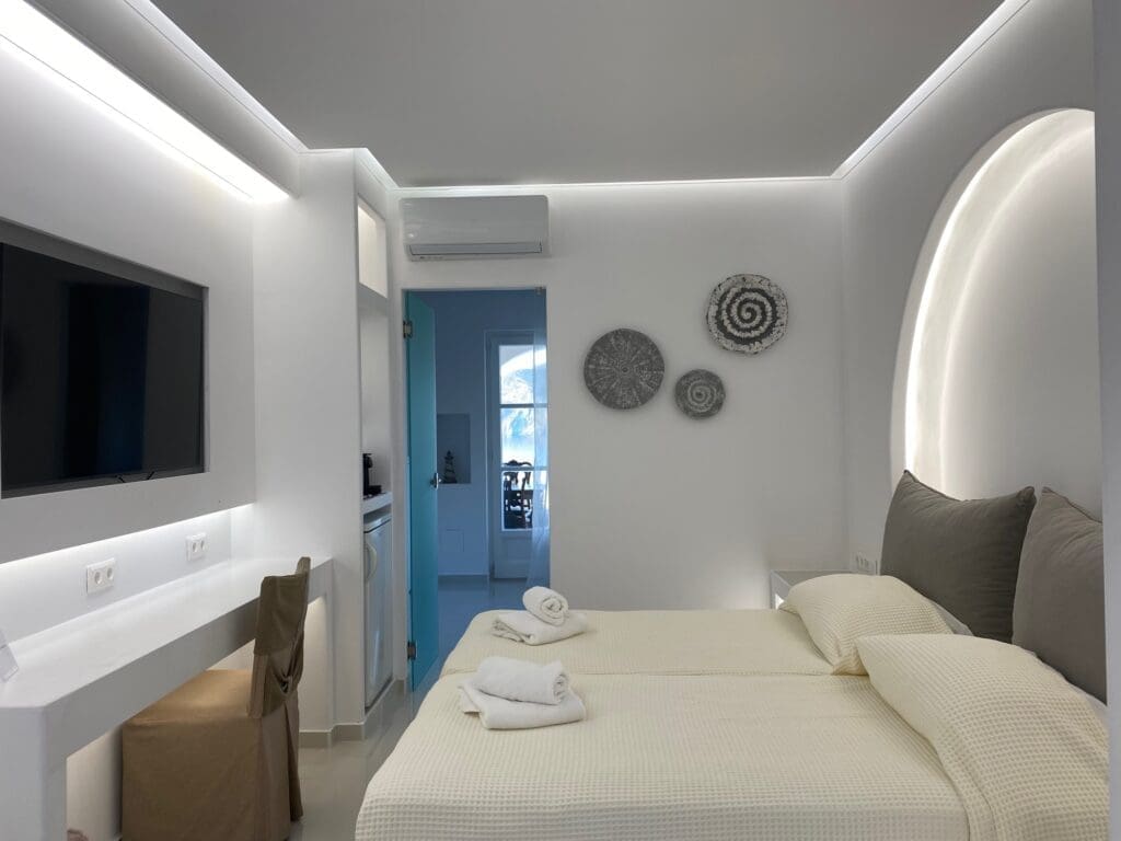 Each room of the luxury Cycladic villa is thoughtfully designed with comfort, privacy, and Cycladic-inspired decor, providing an ideal setting for relaxation, family stays, or group retreats.